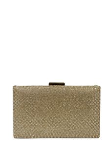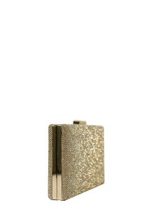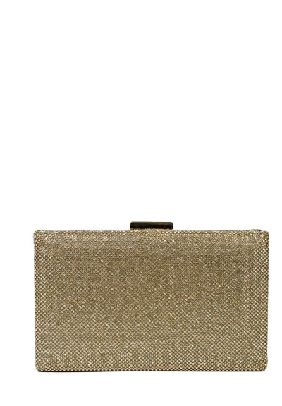 Bolsa clutch dourada com aplicações de cristais. Fechamento por encaixe. Acompanha alça em metal. Altura: 11cm / Largura: 19cm / Espessura: 3cm