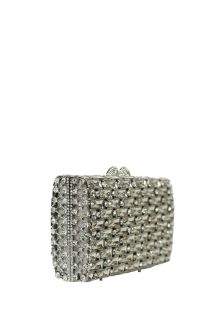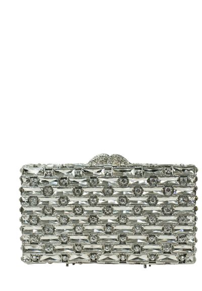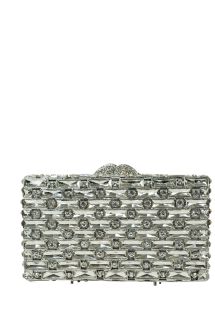 Bolsa clutch prata com aplicações de cristais. Fechamento magnético. Acompanha alça de metal. Altura: 10cm / Largura: 18cm / Espessura: 4cm